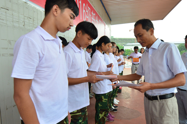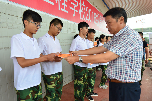 随后,由学生处施明璋主任进行了总结性地讲话。在讲话中,施明璋主任肯定了教官和学生们克服了酷热难耐和疲惫不堪的重重困难,以战士般的钢铁意志和严谨的组织纪律观念,刻苦学习、听从指挥、服从领导,发扬了团结、紧张、严肃、认真的优良作风,为提高自身素质而努力;施明璋主任指出本次军训对提高学生们的国防意识、磨练学生的坚强意志、培养学生克服困难的大无畏精神,提高学生思想境界和爱国主义意识起到了非常积极的作用;同时希望同学们继续发扬解放军的优良传统,把不怕苦不怕累和高度的组织纪律性应用的学习生活中,尽快适应职业高中的学习和生活。珍惜时间,努力学习专业知识和技能,掌握服务国家、服务社会的精深本领,并在学习中认真践行“立心、立行、立业”的教育思想,学会做人、学会生存、学会学习、学会工作,培养正确的人生观、世界观、价值观。