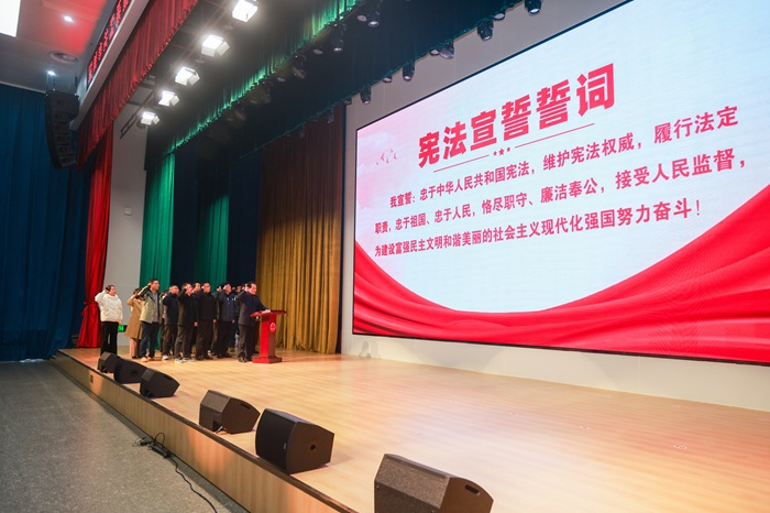 随后,活动进行了庄严的宪法宣誓。学校行政干部及教师代表走向主席台面向《宪法》庄严肃立,高举右拳,在饶俊的带领下郑重宣誓:“我宣誓:忠于中华人民共和国宪法,维护宪法权威,履行法定职责,忠于祖国……”铿锵有力的誓言回荡在报告厅内,彰显了教育工作者忠于宪法、依法从教的坚定决心。宣誓仪式后学校2025级平面设计1班丁嘉优同学号召全体同学从自己做起,把“尊崇、学习、遵守、维护、运用宪法”的信念,转化为实实在在的行动,为建设法治中国贡献大家的青春担当。