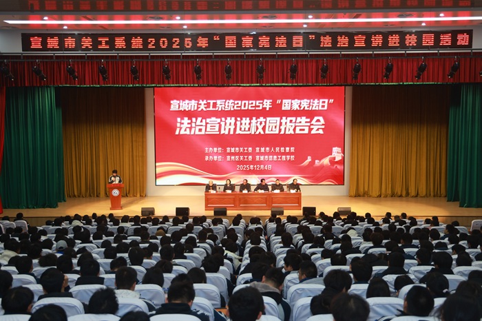 为学习宣传贯彻习近平法治思想,推动宪法深入人心,在全国第十二个“国家宪法日”来临之际,12月4日下午,由宣城市关心下一代工作委员会、宣城市人民检察院主办,宣州区关心下一代工作委员会、宣城市信息工程学校承办的“宣城市关工系统2025年‘国家宪法日’法治宣讲进校园报告会”在学校启智楼报告厅隆重举行。市、区两级关工委领导、市人民检察院检察官、学校师生代表共700余人参与了此次法治宣讲活动。