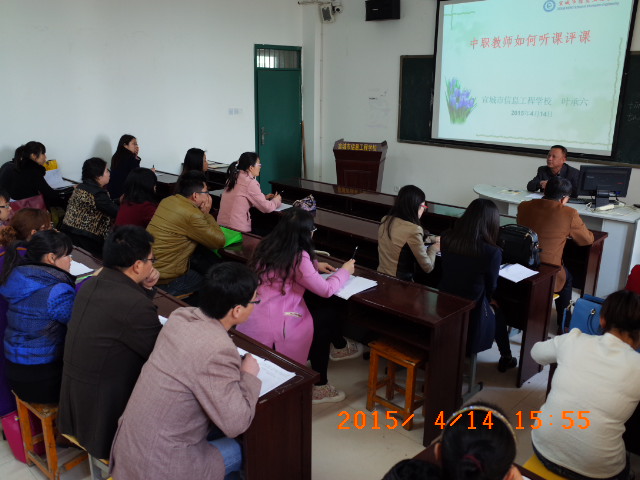 2015年4月14日下午,教研处叶承六主任为我校青年教师作了题《中职教师如何听课评课》的讲座。讲座从教师听课“令人忧”、“怎么听”、“听什么”及评课“怎么评”四个方面,针对目前教师听课的基本状况,采用丰富的实例,结合自己听评课的体会,为教师介绍了听课的一些技巧及评课策略。